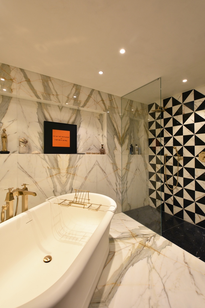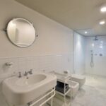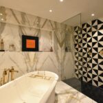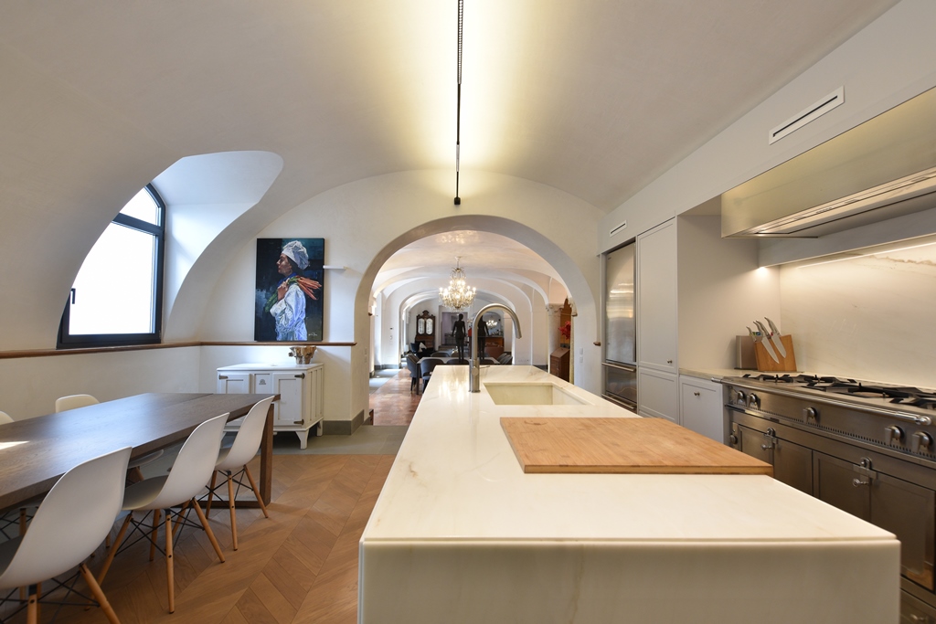 L’elemento di maggior innovatività consiste nel sistema delle boiserie su misura in essenze lignee pregiate. Tali elementi non rivestono solo una funzione decorativa, ma agiscono come dispositivi architettonici: nascondono vani abitativi e tecnici, integrano aperture e definiscono nuovi percorsi spaziali. L’interior design si avvale di arredi d’eccellenza, selezionati per coerenza materica e iconicità formale, che si stagliano negli spazi senza sovrastarli, rispettando le proporzioni originali dei volumi. La cucina e il mobile dispensa sotto l’arcata integrano tecnologie di alto livello, in una struttura dal design essenziale. L’uso di materiali lapidei e laccature crea un contrasto sofisticato con il calore del legno presente nel resto della dimora. Le camere sono state ripensate come suite private, dove la privacy e il comfort acustico sono garantiti da una nuova distribuzione degli spazi. Le sale da bagno presentano finiture di alto profilo e soluzioni custom-made, quali gli intarsi in marmo policromo, che trasformano l’ambiente di servizio in un luogo di relax sensoriale. Le ampie porzioni di pavimento vetrate offrono l’occasione per dilatare in verticale gli spazi e collocare al livello sottostante installazioni artistiche.